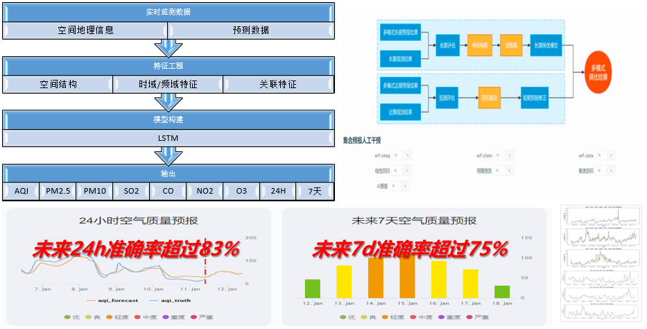 建立“机器学习+数值模式”的双预报引擎智能择优预报技术体系,以WRF-CMAQ、WRF-Chem大气模型为基础, 以多源数据融合和人工智能为核心技术,  融合资料同化、 多模式集合预报、 机器学习、 深度学习等先进技术,  自主研发了业内先进的空气质量预报预警系统,实现了多时间尺度 (短临-近期-中期-长期)、多空间尺度(区域、 城市、站点、网格)的预测预报。